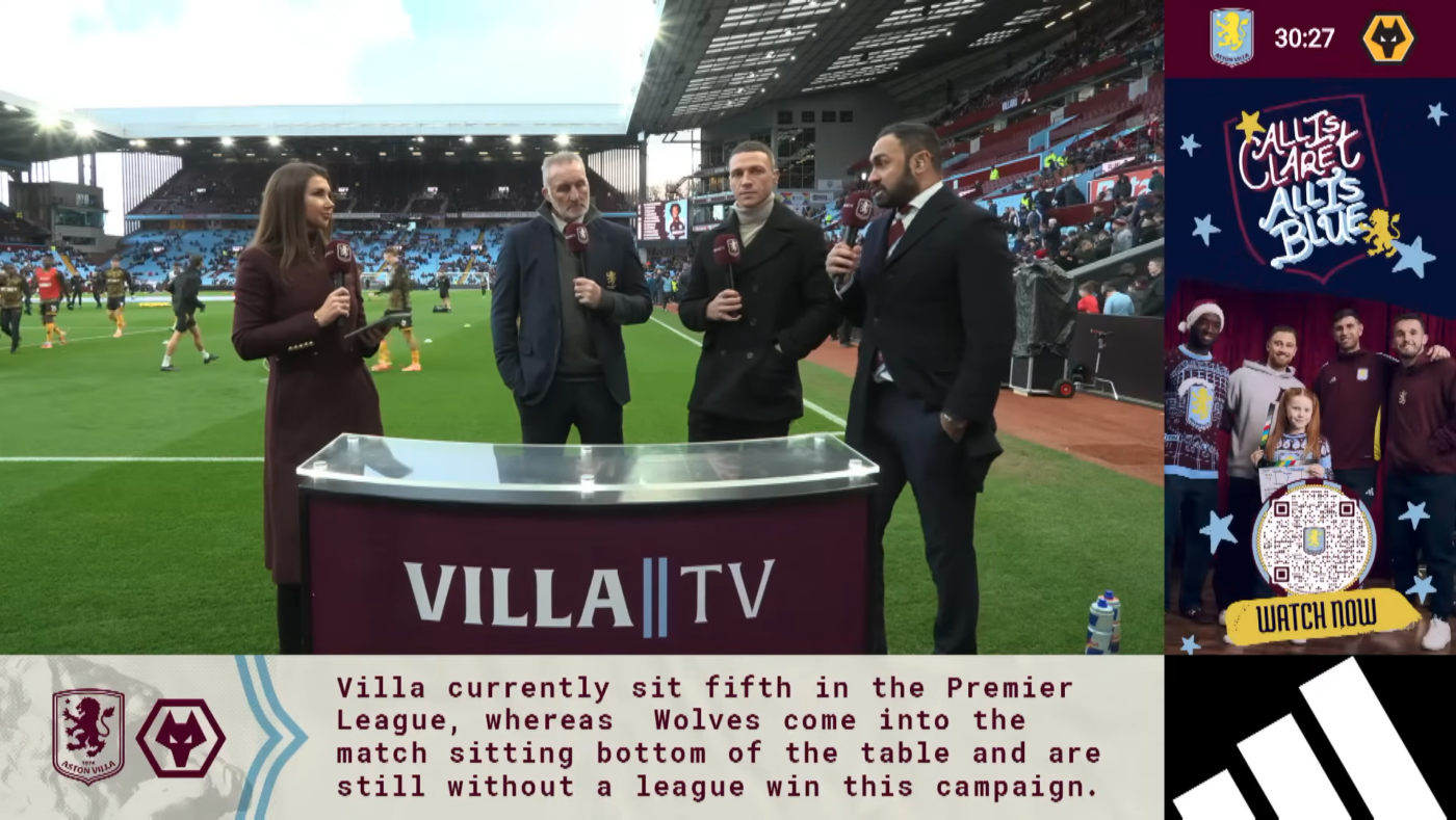 To enhance their digital presence and fan engagement, Aston Villa F.C. wanted to transform its match-day coverage to appeal across multiple age groups and genders at the club. The challenge was to create an interactive and immersive viewing experience that could integrate live audience participation and real-time match statistics into the content. The solution also needed to deliver high-quality streams while seamlessly balancing fan engagement with brand activations and logo placement.